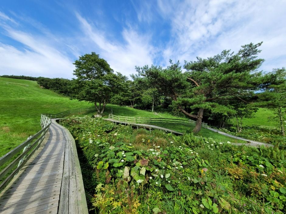 약 1.3km의 산책로는 왕복 40~50분 정도 소요되며, 경사가 완만해 걷기에 부담이 없습니다. 초입부터 탁 트인 풍경을 감상할 수 있고, 중간중간 포토존이 마련되어 있어 사진 찍기에도 좋습니다. 특히 봄부터 가을까지는 양들이 초지에서 방목되어 자연 그대로의 모습을 볼 수 있고, 겨울에는 축사 안에서 지내는 양들을 관찰할 수 있습니다.