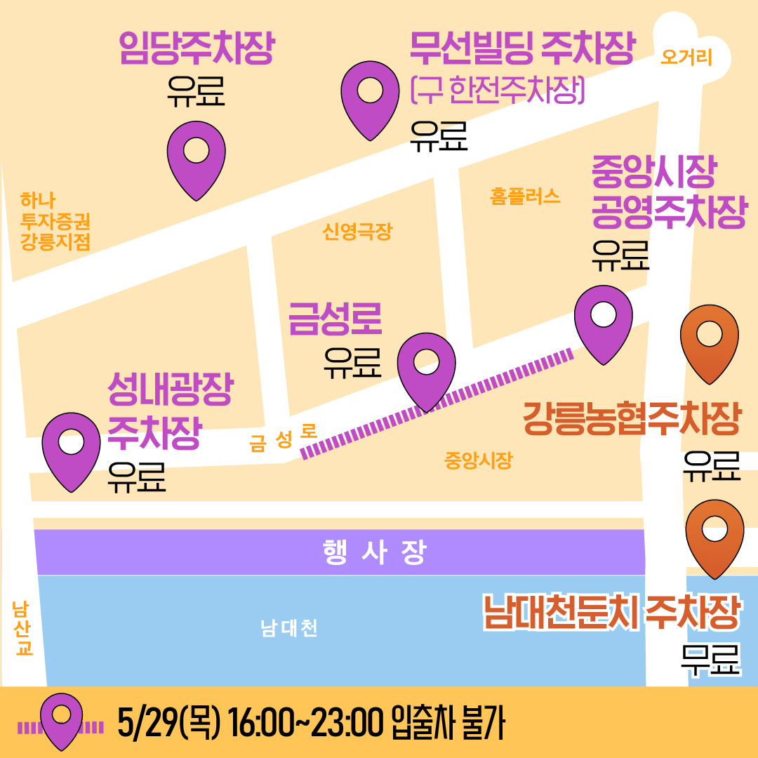 • 남대천 공영주차장: 행사장 부스 설치로 이용 불가