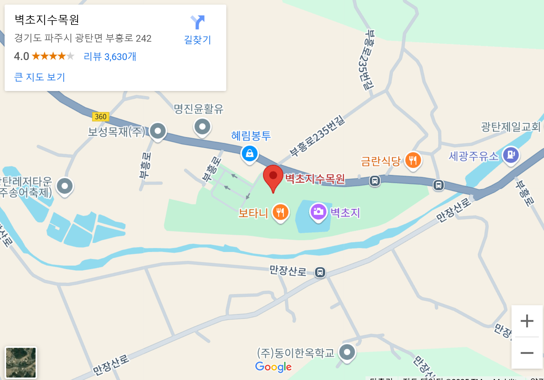 - 09:00: 서울 출발 → (약 1시간) → 벽초지수목원 도착