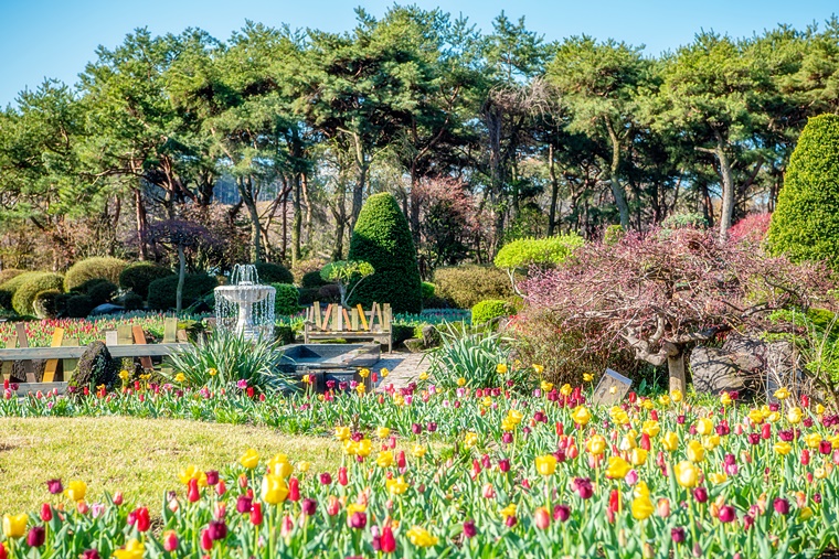 - 봄(4~5월): 튤립, 철쭉, 수선화 등 꽃축제 분위기, 유럽풍 정원에 형형색색의 봄꽃이 가득.