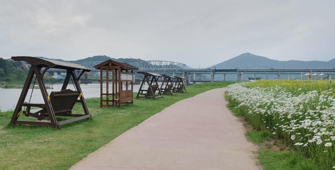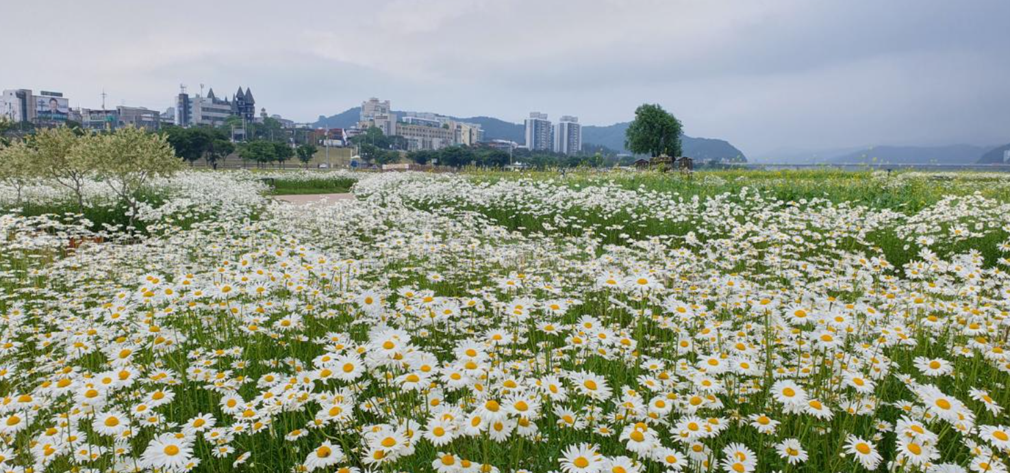 공주 미르섬은 매년 5~6월이 되면 하얀 꽃물결로 뒤덮입니다. 바로 샤스타데이지가 만개하는 시기입니다. 금강을 따라 펼쳐지는 이 아름다운 풍경은 사진작가와 여행객 사이에서 인생샷 명소로 유명하며, 계절의 정수를 만끽할 수 있는 곳으로 손꼽힙니다.