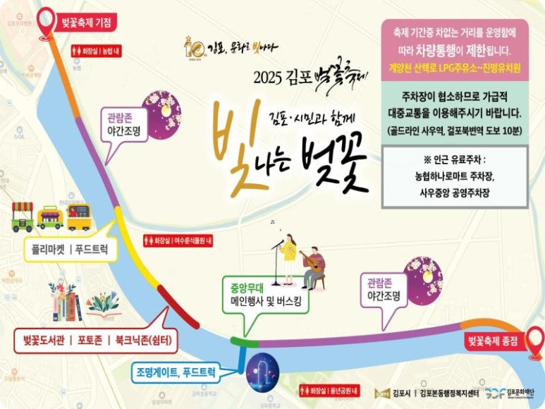 • 지하철 5호선 김포공항역 + 김포 골드라인: 김포 골드라인으로 걸포북변역, 사우역 등 내려 축제장 인근으로 이동 가능(택시·도보).
