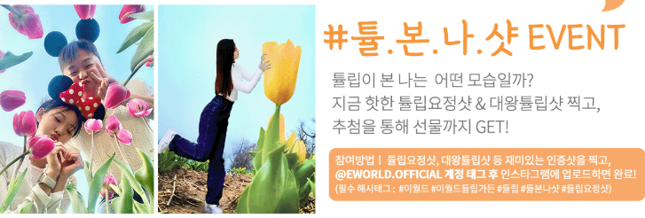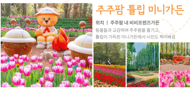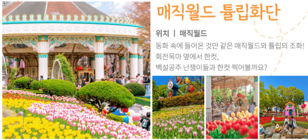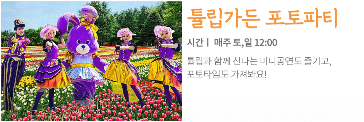 - 테마: 매년 ‘튤립 파라다이스’, ‘유럽풍 정원’, ‘러블리 스프링’ 등 다양한 콘셉트를 적용해, 파크 곳곳을 알록달록하게 꾸며 튤립 정원을 만날 수 있습니다.