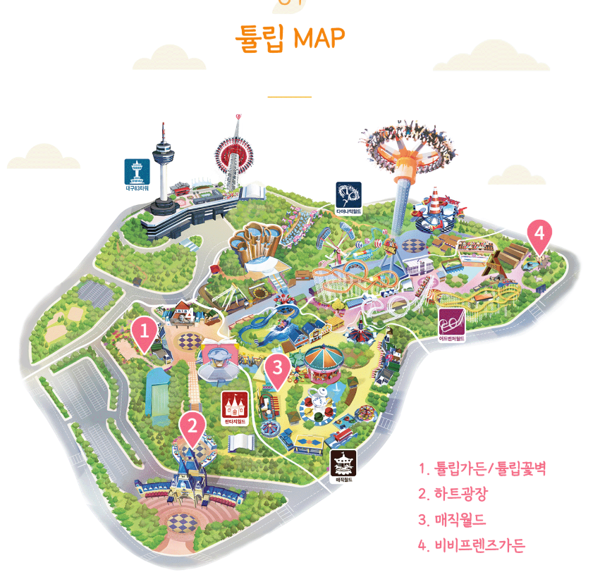 - 10~12시: 튤립 정원·포토존 투어 + 인기 놀이기구 1~2개 탑승