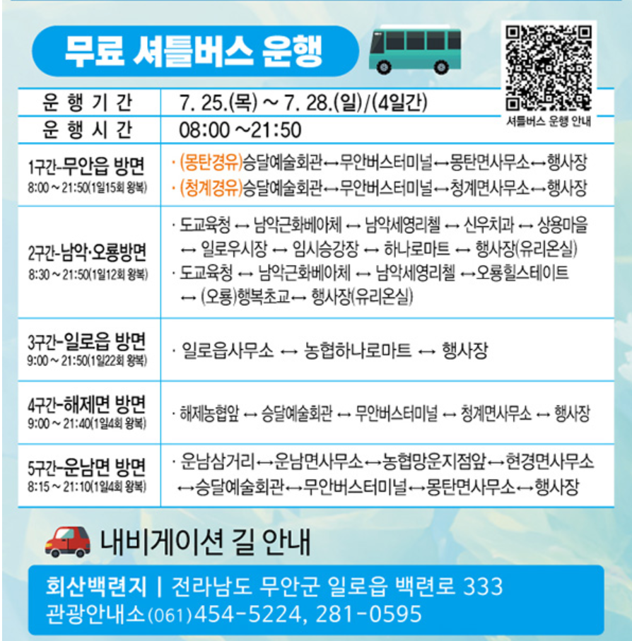 주차장은 행사장 입구와 주변에 넉넉하게 마련되어 있으며, 장애인 및 유아동반 가족을 위한 전용 구역도 운영됩니다. 다만 주말이나 주요 시간대에는 혼잡할 수 있으니 대중교통이나 축제 기간에 운영되는 무안군 셔틀버스를 활용하는 것도 좋은 방법입니다.