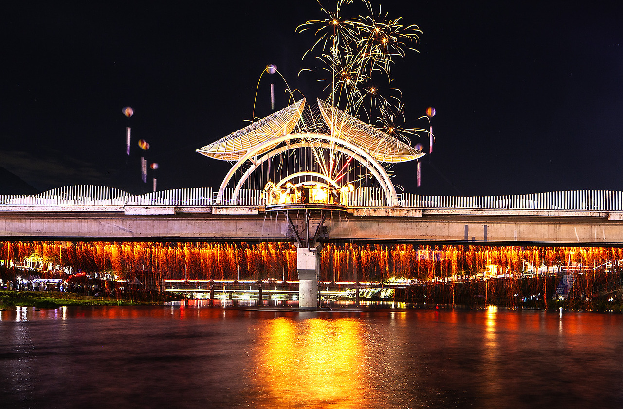 - 하늘이 아닌 지면을 향해 떨어지는 불빛이 특징으로, 수면에 반사된 불꽃이 환상적인 분위기를 자아냅니다.