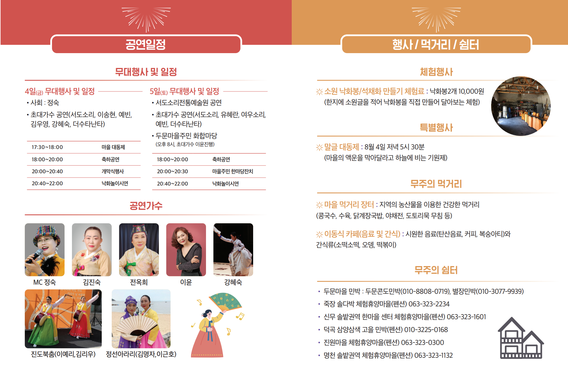- 매년 6월 초, 전북 무주군 안성면 두문마을에서 열리며, 전통공연과 체험행사까지 함께 즐길 수 있습니다.