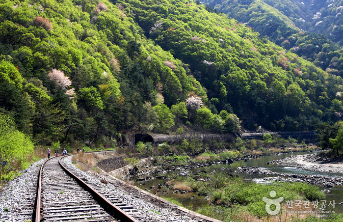 사진 포인트: 철길 위에서의 단체 사진, 주변 산과 계곡 배경