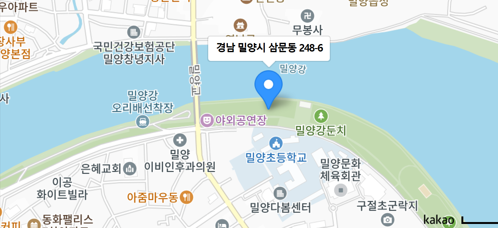 - 내비게이션 검색: ‘밀양강 야외공연장’ 또는 ‘영남루’ 입력
