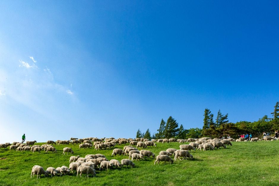5월 신록과 푸른 하늘 아래, 양들과 함께하는 힐링 산책! 언덕을 따라 이어지는 산책로는 가족 여행자와 사진가들에게 사랑받는 명소입니다.