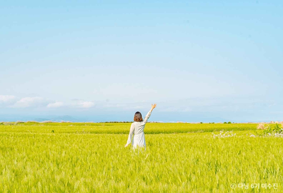 - 가파도 청보리밭에서는 바람 따라 물결치는 보리밭을 로우 앵글로 찍어보세요. 푸른 하늘과 대비되어 감성 사진 완성!