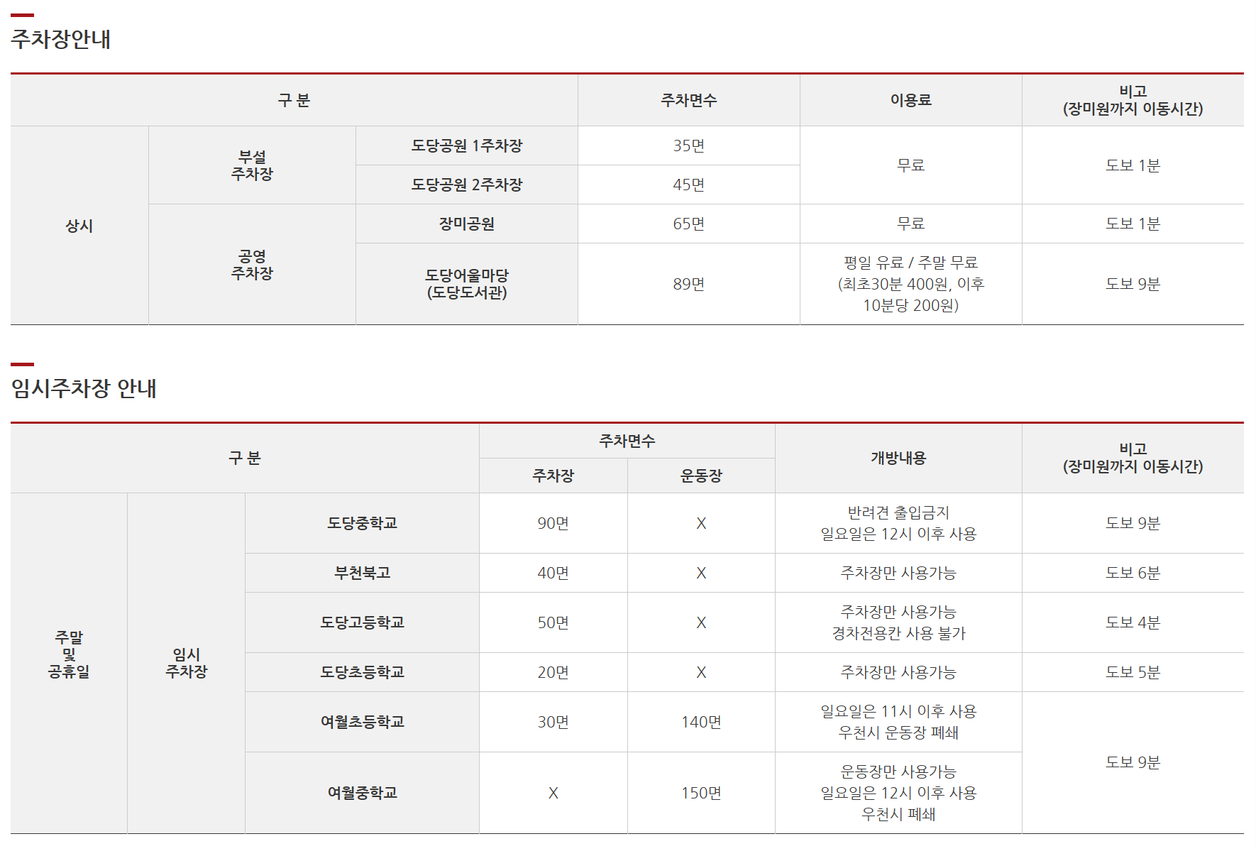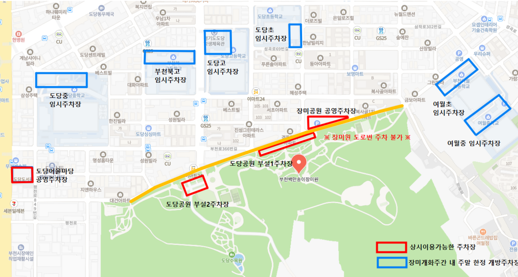 내비게이션에 ‘부천백만송이장미원’ 혹은 주소 ‘경기도 부천시 오정구 성곡로 63번길 99’를 입력하면 됩니다. 하지만 도당공원 부설주차장과 주변 공영주차장은 규모가 작아 주말에는 조기 만차 가능성이 높습니다.