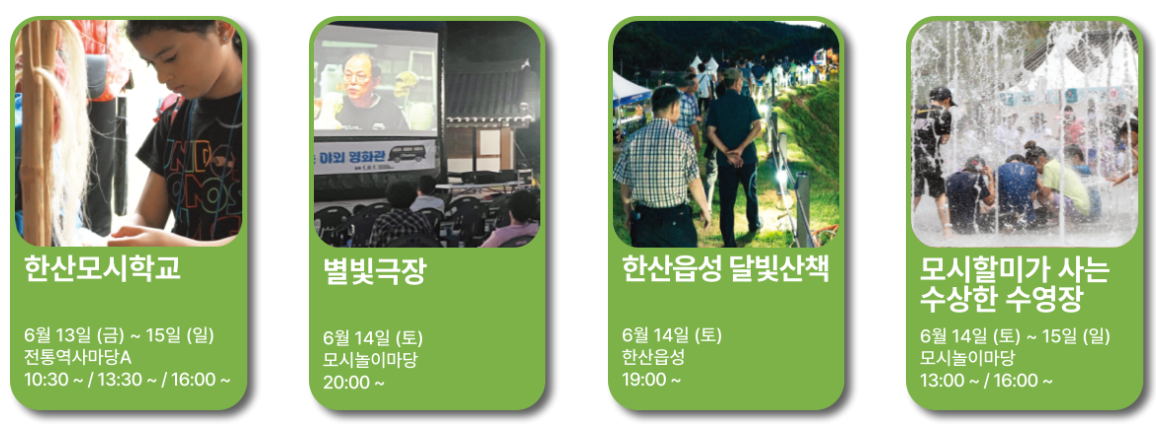 축제에서는 직접 모시를 짜보는 ‘미니베틀 체험’, 전통 길쌈 문화를 재현한 ‘저산팔읍 길쌈놀이’, 한산소곡주와 함께 옛 정취를 느낄 수 있는 ‘한산주막 체험’ 등 다양한 프로그램이 준비돼 있습니다. 특히 ‘한산모시학교’는 초등학생부터 어른까지 모두 참여 가능하며, 체험비는 무료로 운영됩니다.