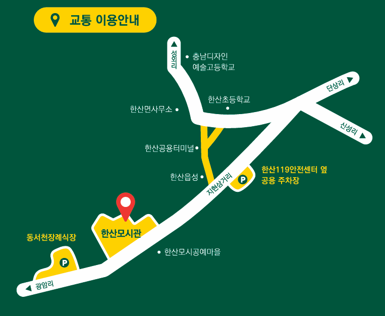 축제 기간에는 임시 주차장과 셔틀버스가 운영됩니다. 제1주차장은 동서천장례식장 인근(충남 서천군 기산면 충절로 1035-4), 제2주차장은 한산119안전센터 옆(한산면 충절로 1164)에 위치해 있습니다. 셔틀버스는 10분 간격으로 한산모시관, 한산읍성, 한산터미널 등을 경유하며 운행되므로 대중교통 이용자도 편리하게 접근할 수 있습니다.