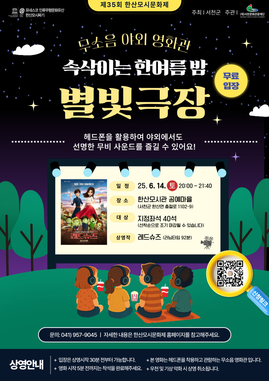 서천 한산모시문화제에서는 전통과 현대가 어우러진 무대 공연도 함께 펼쳐집니다. 축제 첫날에는 트로트 가수 장민호, 박민수, 정동하 등이 출연하는 개막 공연이 열리며, 둘째 날에는 ‘서천필하모니오케스트라’와 소리꾼 박애리의 협연이 있는 바람음악회가 열립니다. 또, 모시관 인근에서는 ‘속삭이는 한여름밤 별빛극장’이 운영돼 낭만적인 야외 영화 감상도 가능합니다.