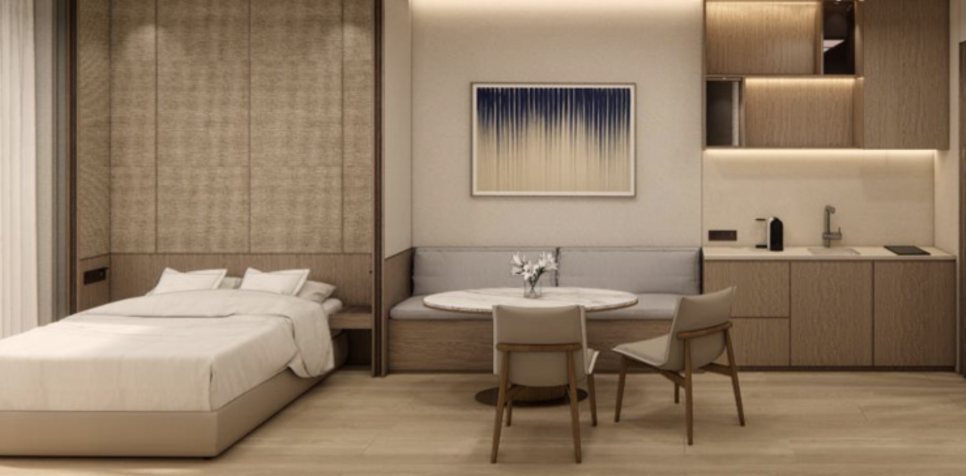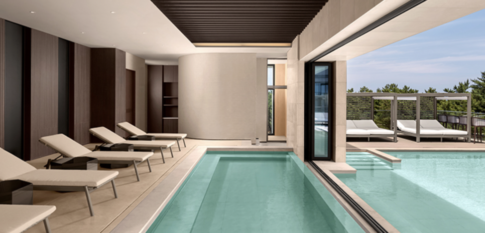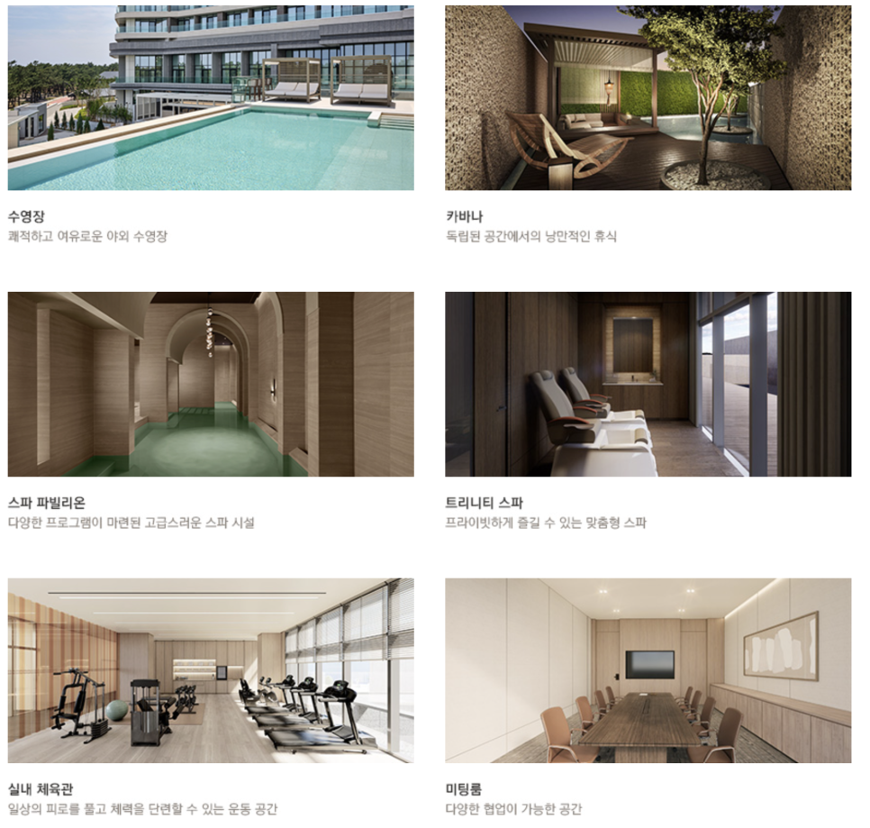 반면, 레지던스 부대시설은 스파 파빌리온, 실내체육관, 미팅룸, 무인택배함, 코인 런드리, 에노테카(와인바), 아트샵, 라이브러리 등 생활형 숙소답게 장기 투숙에 최적화되어 있습니다.