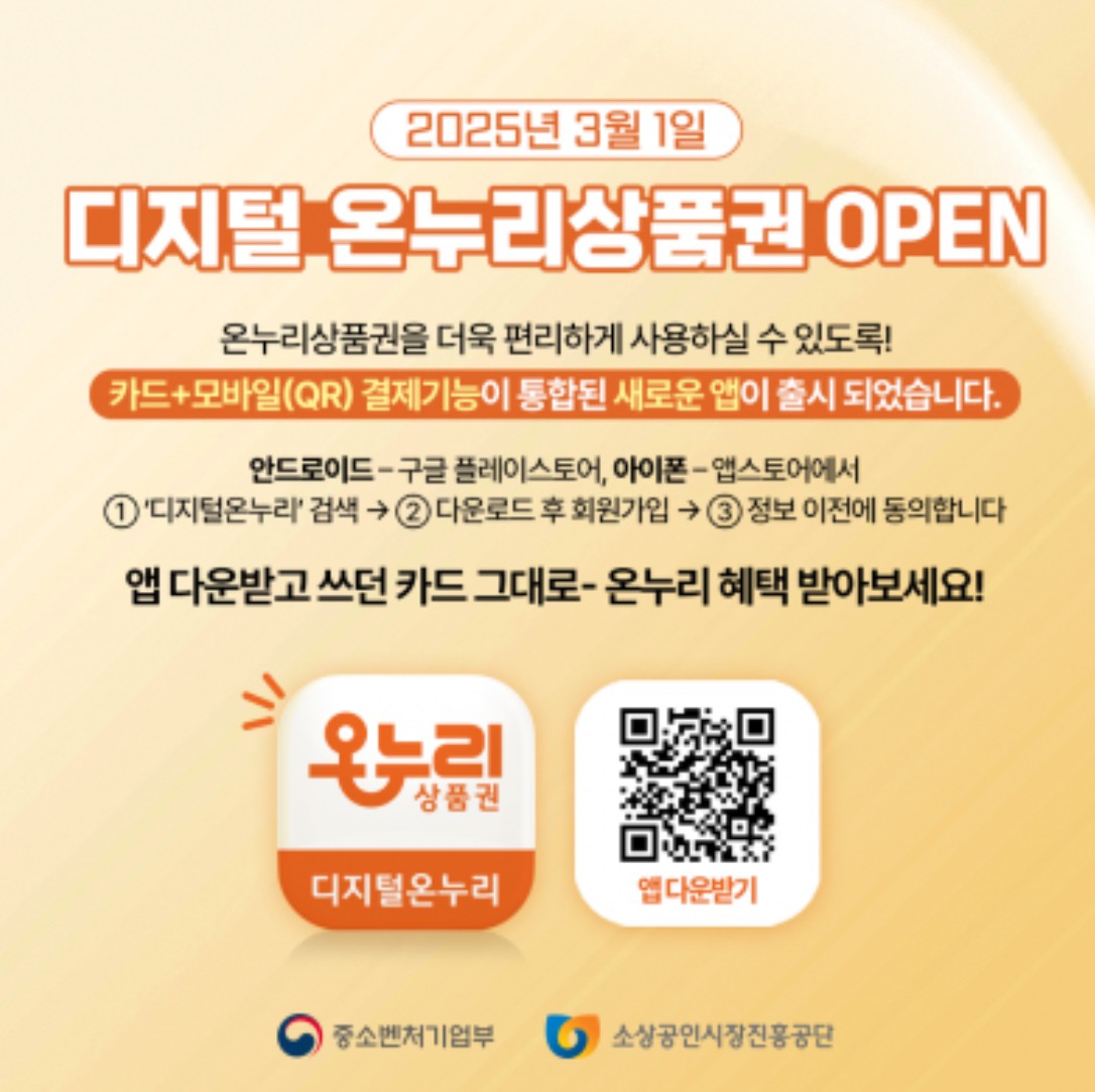 2025년 3월 1일, 카드+모바일(QR) 결제기능이 통합된 하나의 앱, '디지털 온누리상품권'을 앱스토어(애플)와 구글플레이(안드로이드)에서 다운로드할 수 있습니다. 카드결제와 QR결제를 하나로! 10% 할인, 전통시장 소득공제 최대 40% 혜택도 그대로!