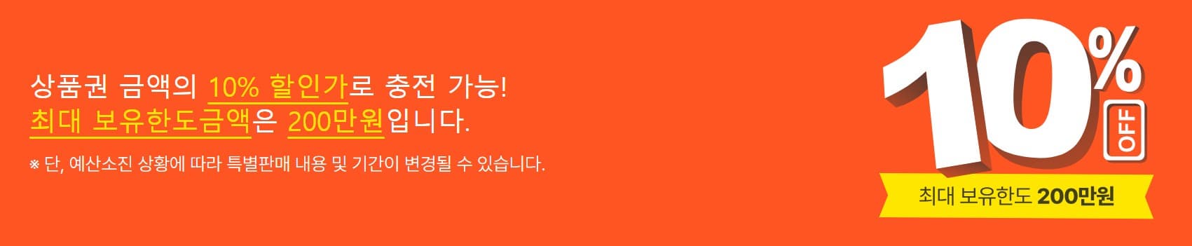 - 충전하고자 하는 금액 충전 시 10% 할인가로 충전되며 최대 보유한도금액 200만 원까지 가능