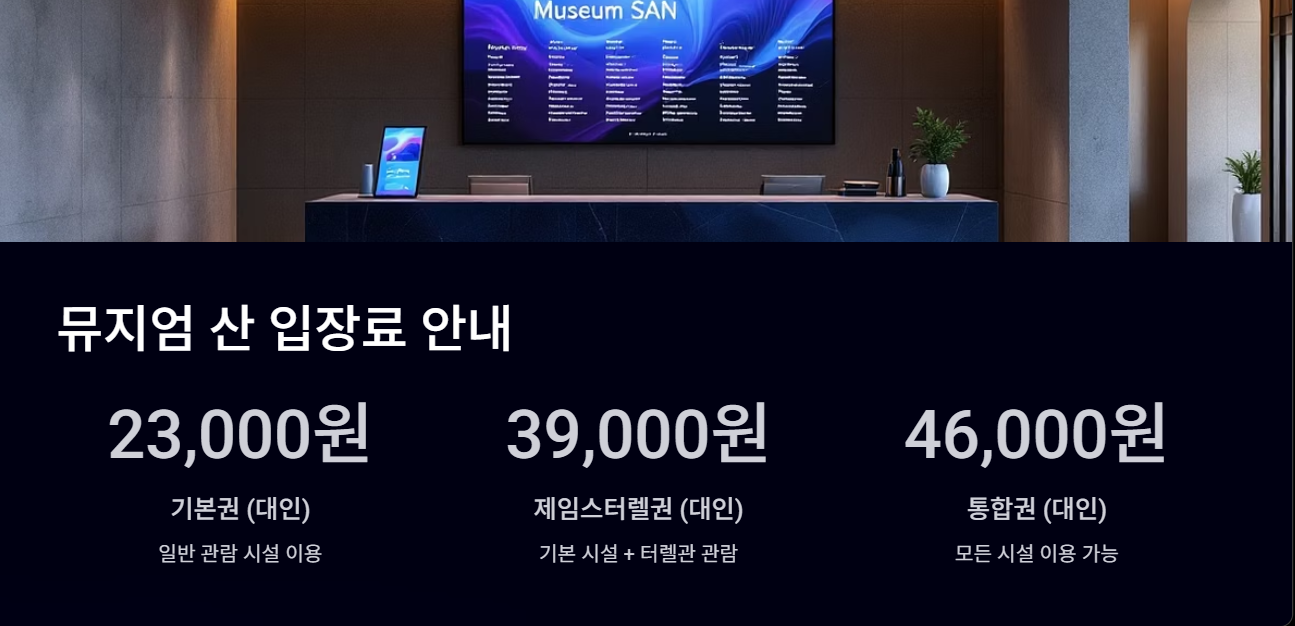 뮤지엄산 입장권은 통합권, 명상권, 제임스터렐권, 기본권으로 나뉘며 관람 범위에 따라 요금이 달라집니다. 일반 통합권은 대인 기준 46,000원이지만 다음과 같은 할인 조건을 활용하면 더 저렴하게 관람할 수 있습니다.