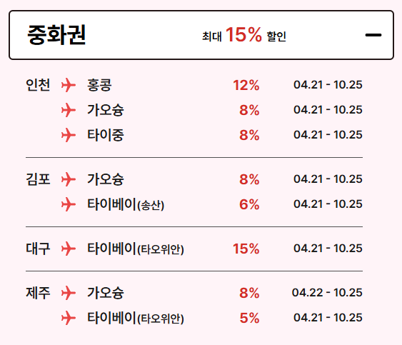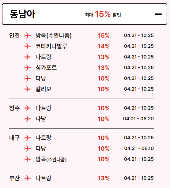 - 코타키나발루, 나트랑, 싱가포르, 다낭 등 주요 노선: 10~14% 할인