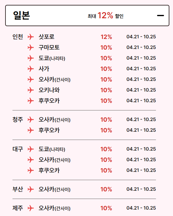 - 삿포로: 12%, 인천발, 04.21 ~ 10.25
