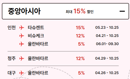 - 울란바토르: 5~12%, 인천·청주·대구발 등 포함