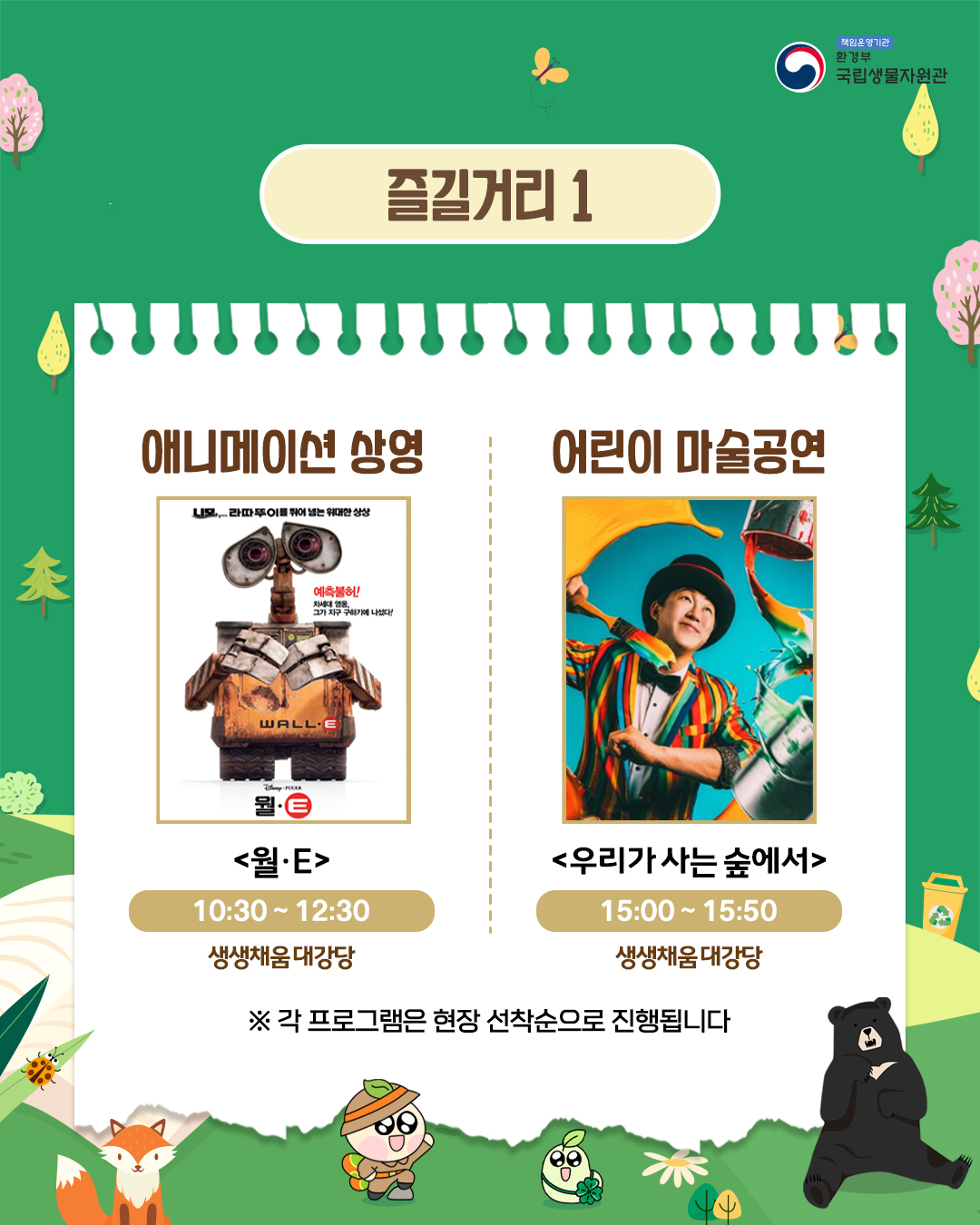 - 내용: 애니메이션 상영, 마술 공연, 키링·텀블러 만들기, 모바일 스탬프 투어 등 생물과 환경을 주제로 한 체험 프로그램이 진행됩니다.