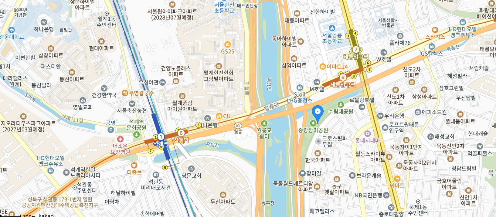 - 7호선 태릉입구역 8번 출구 → 묵동교 방향 도보 이동