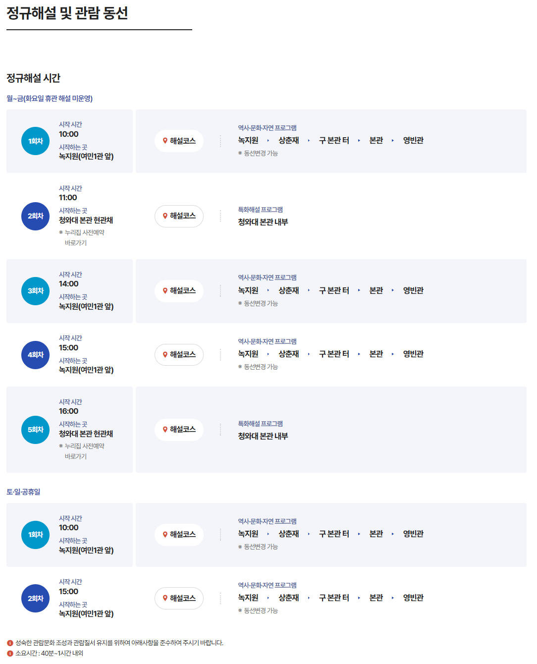 - 본관, 영빈관, 춘추관, 녹지원 등 순서대로 둘러볼 수 있음(동선 안내 표지판 참고)