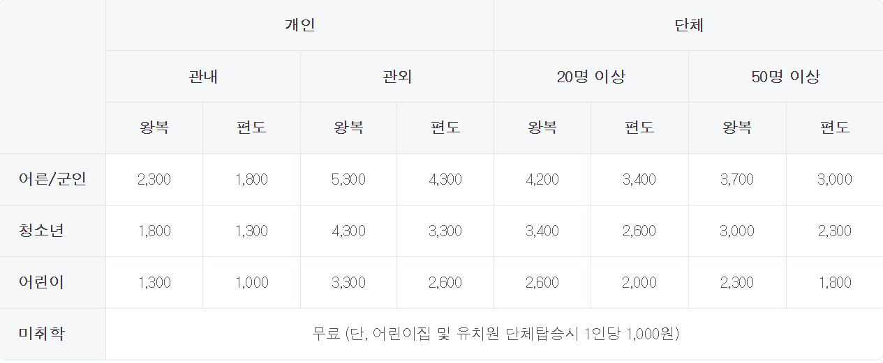 요금은 편도 성인 3,500원, 왕복 4,500원이며, 청소년은 편도 2,500원, 어린이는 2,000원입니다.