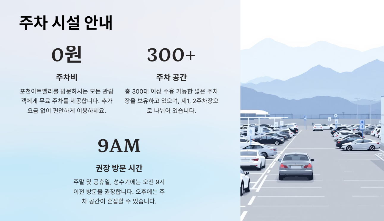 포천아트밸리는 방문객을 위한 넉넉한 무료 주차장을 운영하고 있습니다.
