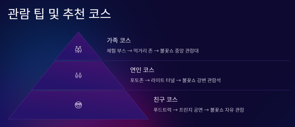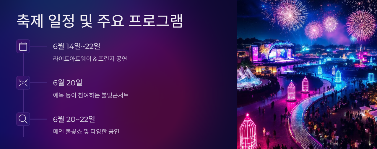 - 주요 프로그램: 데일리 불꽃쇼, 국제 불꽃경연, 드론라이트쇼 등