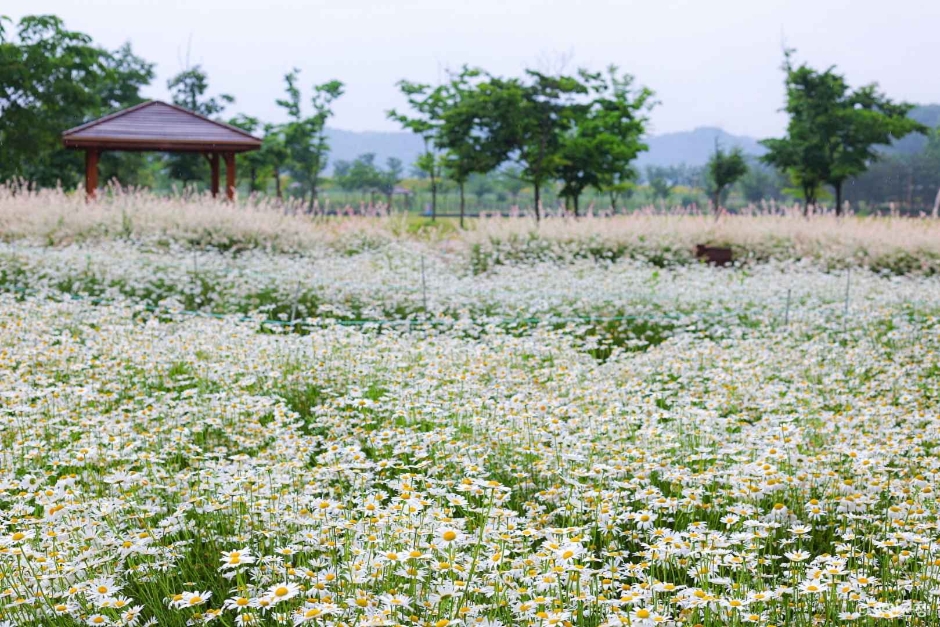 서울에서 함양까지는 고속도로로 직행해 약 두 시간 사십 분이면 닿는다. 공원에 들어서면 축구장 스무 개가 넘는 규모의 금계국 군락이 펼쳐지고, 서하강 둑방 1.5 킬로미터를 따라 노란 꽃파도가 끝없이 이어진다. 게다가 입장료는커녕 주차비조차 받지 않아 부담이 없다.