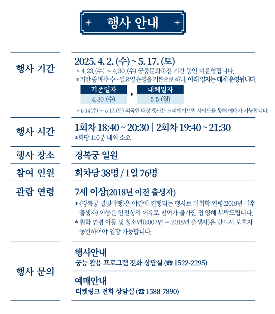 5월)과 가을(910월) 즈음에 일정 기간씩 열리며, 매년 구체적인 날짜와 시간대가 달라집니다. - 행사 기간 중에도 특정 요일은 쉬거나, 우천 시 일부 프로그램이 조정될 수 있으니, 공식 안내 페이지(경복궁 별빛야행 공지)를 항시 확인해 주세요.