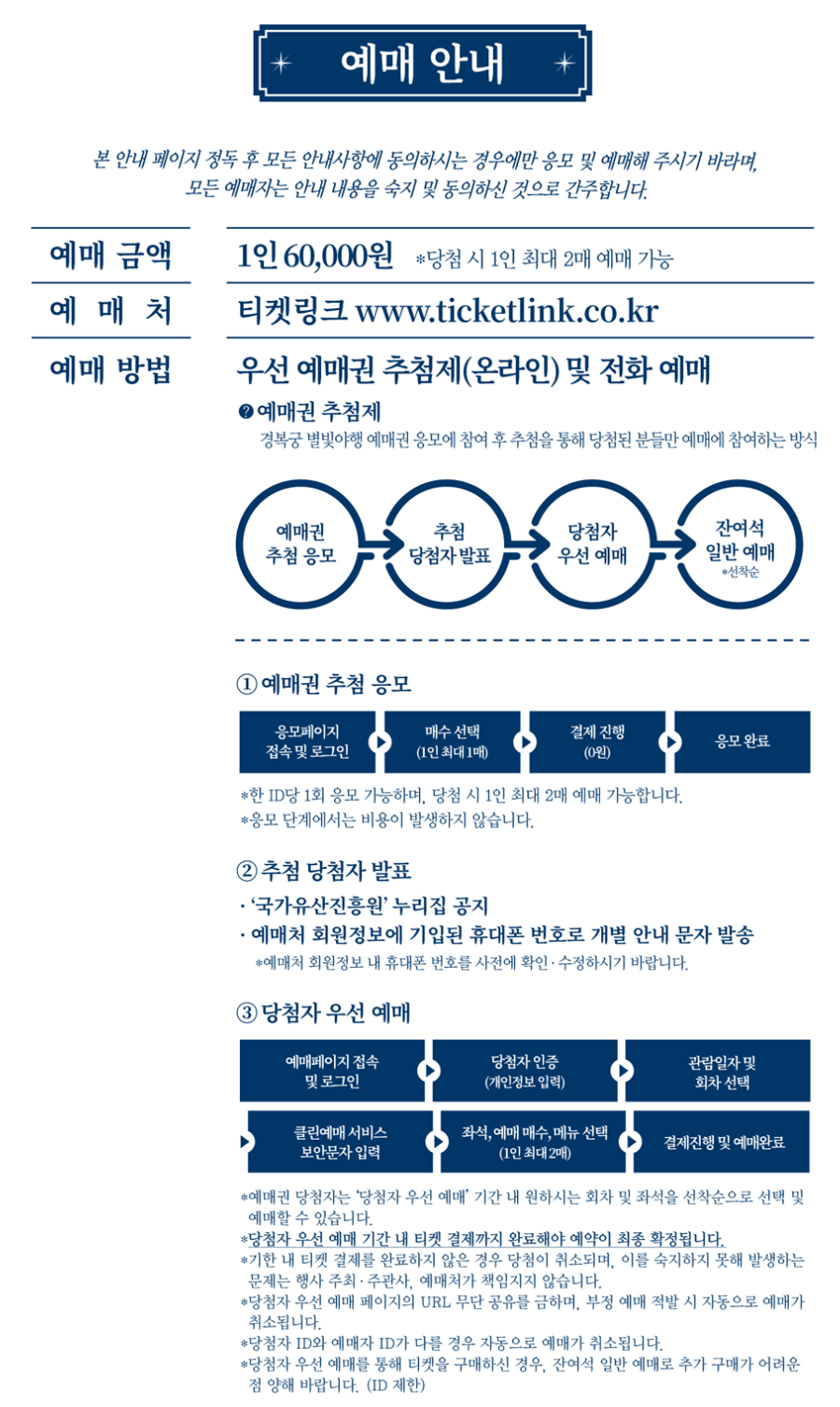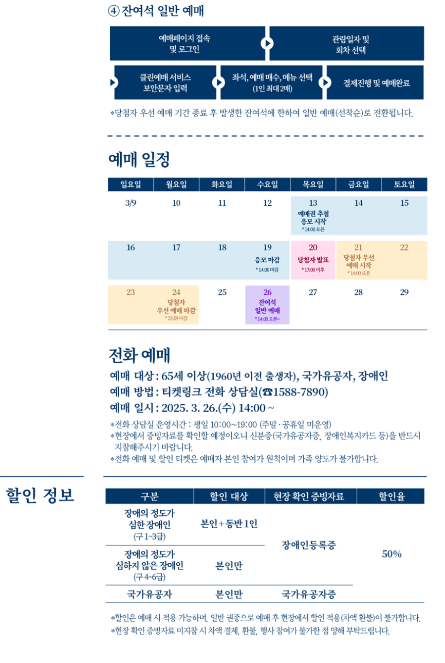 - 예매가 매진되면 추가 티켓을 구하기 어려워지므로, 시간이 맞는 분이라면 조기 예매를 권장합니다.