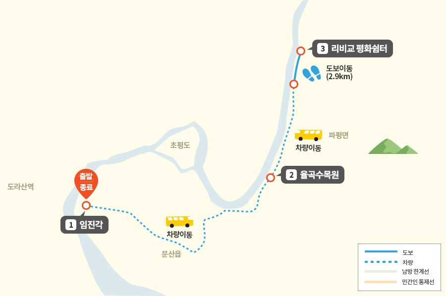 안전상의 이유로 일부 구간은 차량으로 이동하며, 철책길과 주요 명소 등은 직접 걸어서 이동합니다.