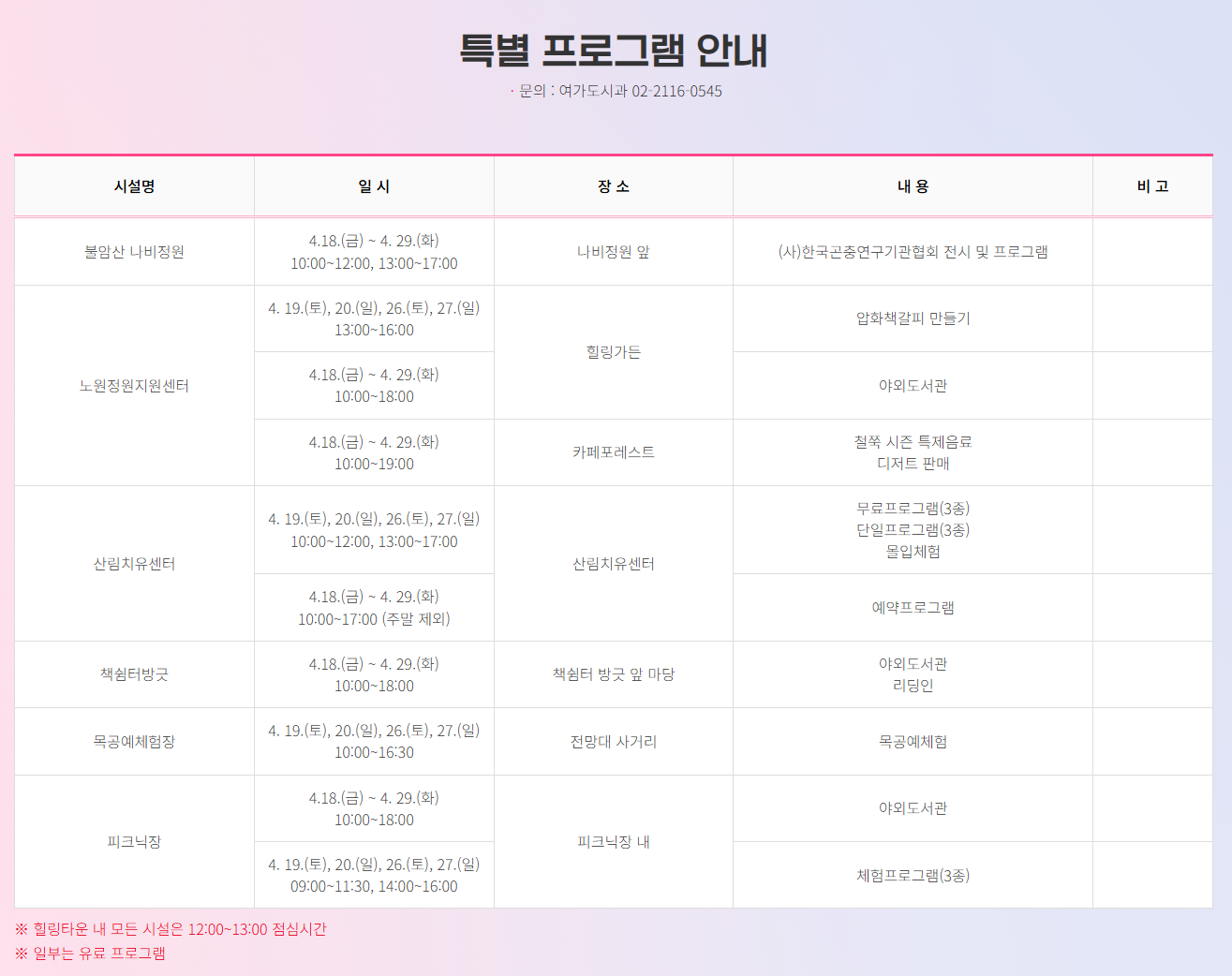 - 숲 테라피 클래스 : 아로마 호흡·맨발걷기, 평일 2회 무료(현장 접수)