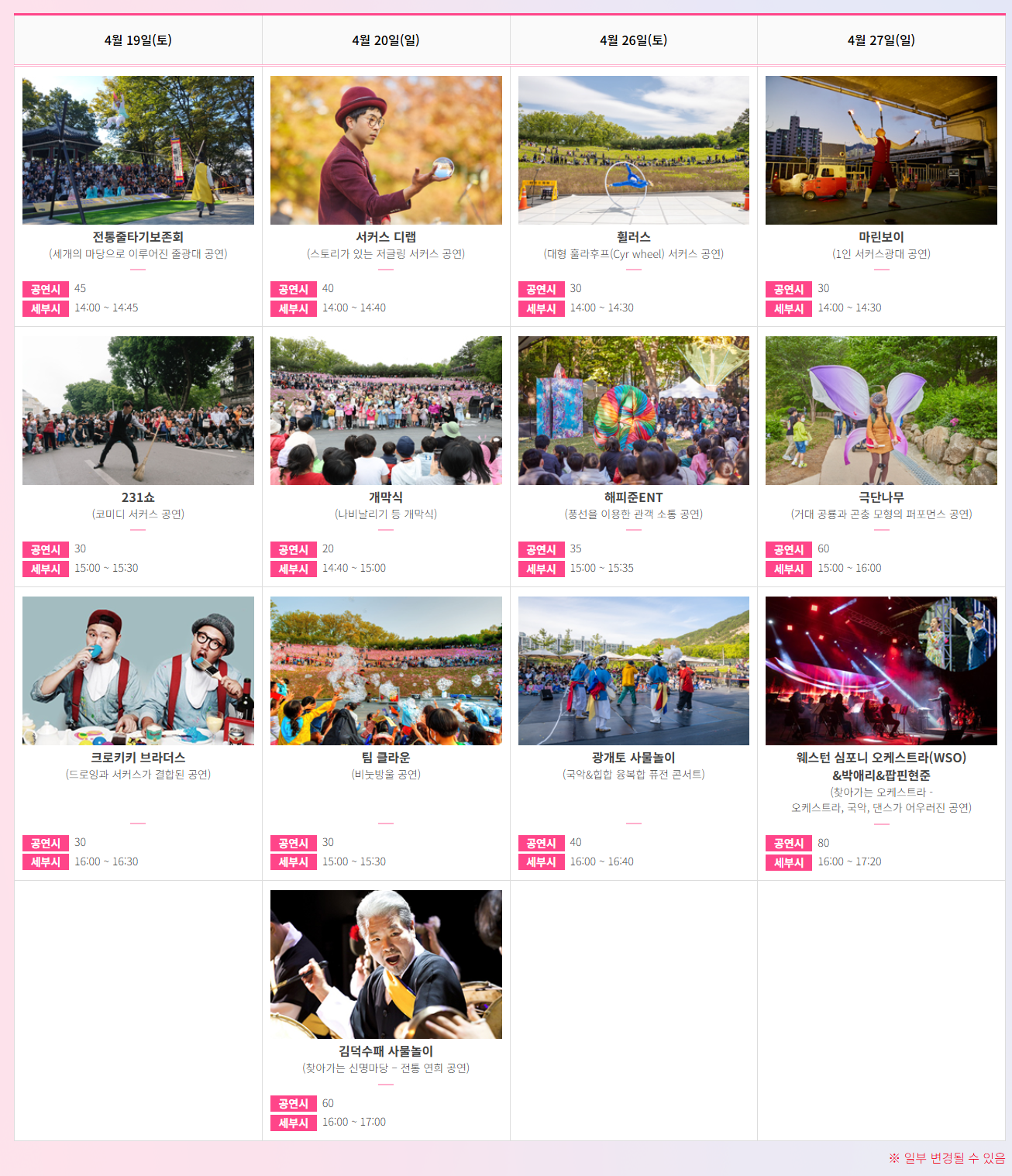 - 기간 : 4 월 18 일(금) ~ 4 월 29 일(화), 개막식 4 / 20 14:40