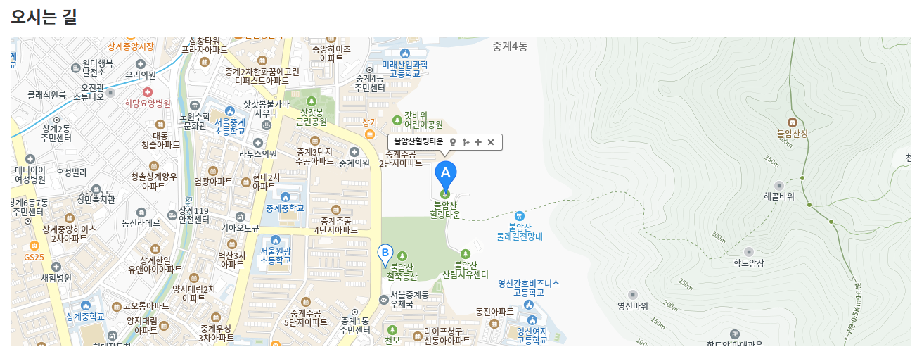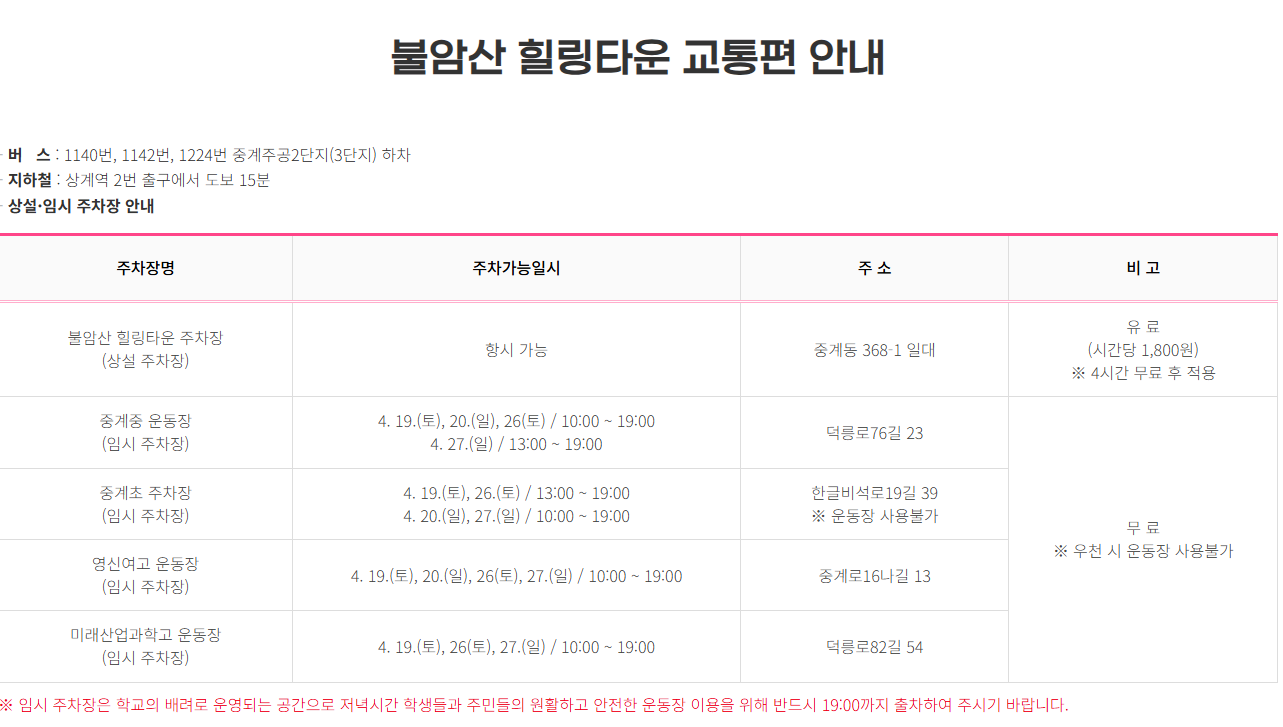 - 지하철 : 4호선 상계역 4번 → 마을버스 1167 → ‘힐링타운’ 하차 5 분