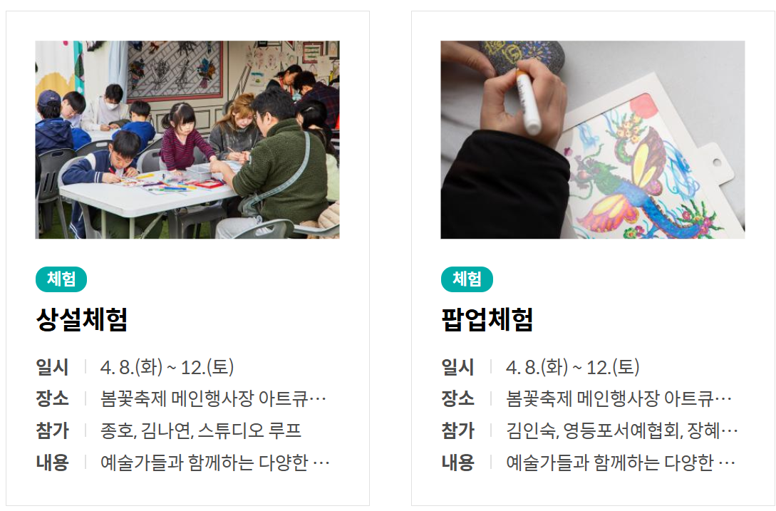 꽃잎을 활용한 캘리그라피 체험, 벚꽃 일러스트 엽서 만들기 등 간단한 수공예·공방 프로그램도 열리는 편입니다. 직접 만든 엽서나 카드에 봄의 기운을 가득 담아 선물하거나 기념품으로 간직해 보세요.