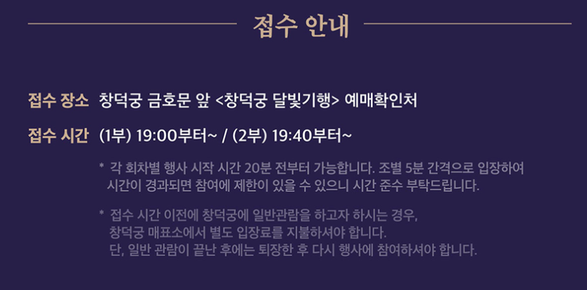 - 창덕궁 달빛 기행은 일반적인 고궁 야간 개방과 달리, 해설사와 함께 제한된 인원이 특정 동선을 따라 밤의 궁궐을 체험하는 프로그램입니다.