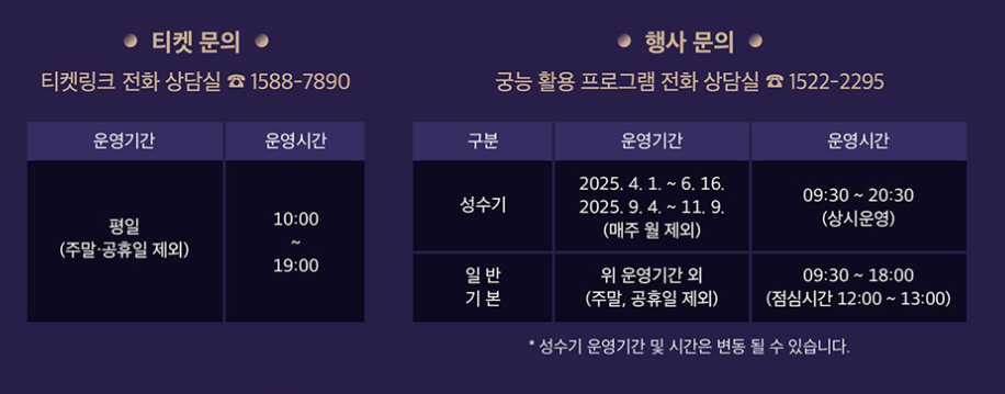 - 일반적으로 3만 원~5만 원 사이(궁중음식 체험 포함 시), 해설 및 공연 포함이라 일반 야간개장보다 가격대가 있습니다.