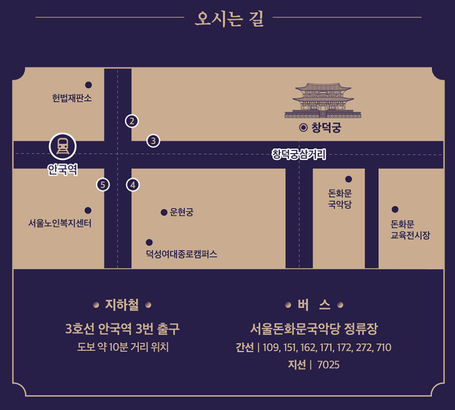 - 창덕궁·현존사거리·안국역 주변 정류장에 하차 후 걸어서 이동. (간선/지선 버스 다수 운행)