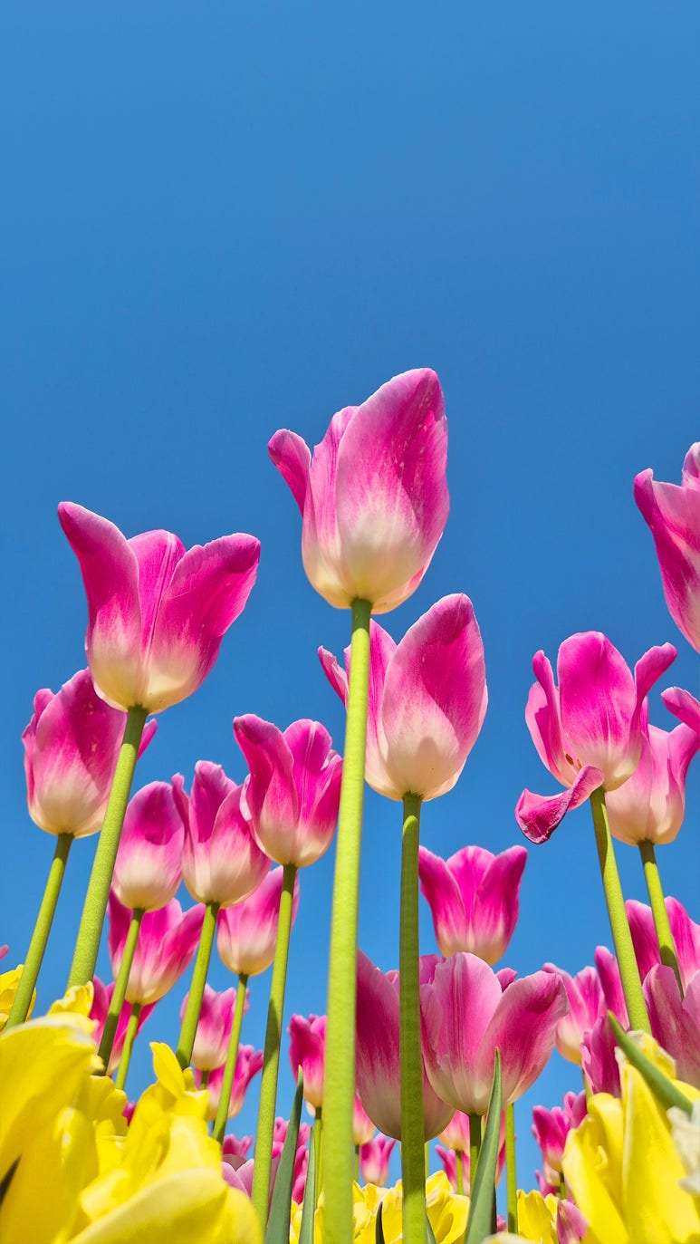 튤립은 초반에는 군락마다 흩어져 피어나지만, 지금 시기에는 모두 만개하여 마치 하나의 거대한 꽃바다를 이룹니다. 빨강, 노랑, 분홍, 보라, 주황 등 다양한 색상의 튤립이 층층이 펼쳐져 한 걸음 한 걸음마다 색다른 장면이 이어집니다.